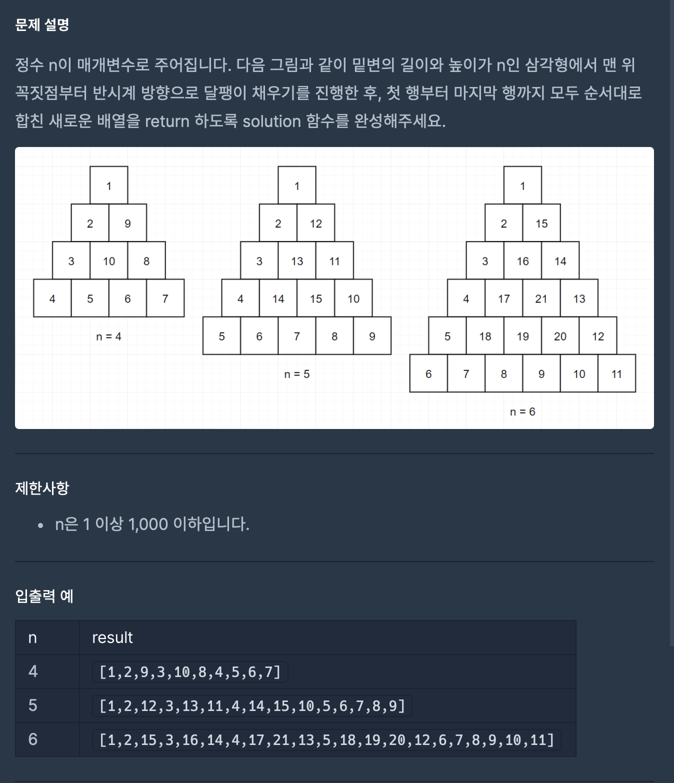 우선 달팽이를 채우는 순서는 1. 아래방향으로 이동 2. 오른쪽으로 이동 3. 대각선 위로 이동이고 이것을 총 n번 실행하게 되며